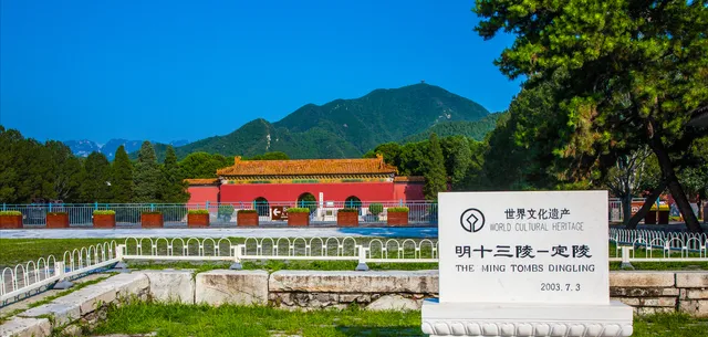 图中的白色石碑就立在定陵外,正面刻着“明十三陵—定陵”,背后那圈红墙黄瓦,远处一线青山,颜色干净得很,拍照的人喜欢蹲低一点取景,栏杆一压,仿佛宝城就要从画里走出来,当年工作人员从这里进进出出,一天能跑好几趟。
