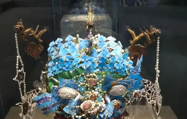 这个华丽家伙叫凤冠,蓝是点翠的蓝,镶金托底,细枝密叶一层压一层,馆里常常要把灯打暗些,它才不那么炸眼,妈妈看见照片就说,“真好看,可惜离了人就只是个壳子了”,以前戴它出殿是仪礼,现在被玻璃罩着只能看不能动。