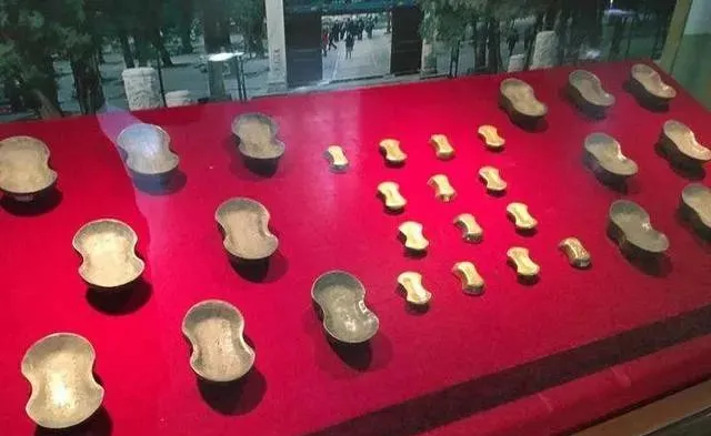 这些叫金锭,肚子鼓鼓的,边口往里收,和电视剧里的“元宝”不太一样,重量各有不同,成色也有差,展柜里一字排开,金色被灯打得发暖,看着是喜气,可一想到它们离开棺中那一刻的仓促,心里又凉半截。