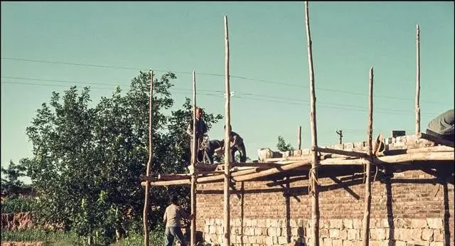 这排细长木杆就是脚手,绳子一缠一打结,架得高不高全看手艺,泥坯墙在日头下慢慢晾,师傅们赤着膀子递砖抹灰,太阳落山了才肯下梯子,哪有什么安全帽,一身的是胆一身的是汗。