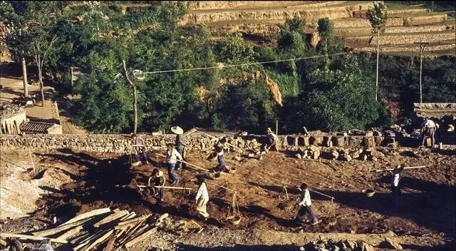 这张更热闹,尘土在阳光里打旋,男人们抡锹,孩子在旁边数数,三十下换人,谁偷懒就被起哄,那时候没有外包队,只有自家人,活成了就算过年。