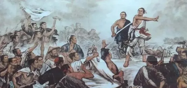 这幅画叫**《陈胜吴广起义》**,宣纸上的墨色一撞就热闹了,挥旗的手臂往前探,口号像要从画里蹦出来,家里墙上挂过类似题材的年画,进屋第一眼就能看到那抹红,小时候站在凳子上数人头,数着数着就忘了作业。
