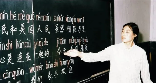 这个场景叫语文公开课,黑板写着拼音和英文字母,老师拿着木教鞭往板书上一点,字划得直,教室里粉笔灰跟着光线漂,我妈说那会儿新课本一来,大家传着翻,边角都卷了,借来抄两页算赚到。