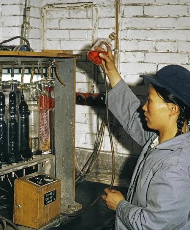 这张叫化验室一角,玻璃管一溜摆着,红色溶液顺着管子走,工装扣子系到顶,袖口磨得发亮,手里那只小橡皮管一捏一松,数据就出来了,奶奶看见总要感叹一句,以前在厂里就是这么干的活,冷天也不敢手抖。