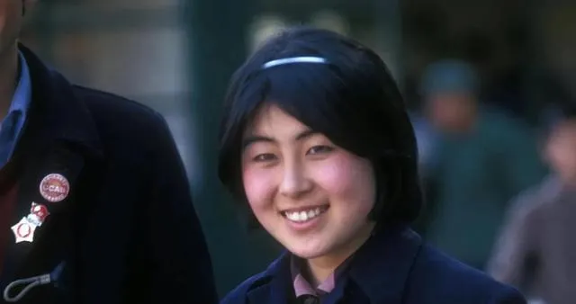 这张近照叫七十年代笑脸,蓝呢子上衣,胸口别着小徽章,额前一条细发箍,脸颊冻得粉粉的,路过的人抬头都要笑一下,以前没有滤镜,笑就是真笑,镜头一靠近,人就亮了。