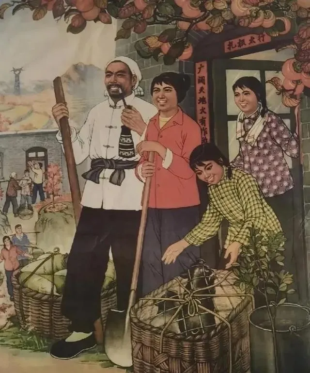 这幅叫年画《农业学大寨》,门口的人笑得见牙,背篓里装得满,屋檐下挂着一串串果子,画里的人手脚都往前伸,像要从纸里走出来,过年贴在灶台边上,蒸汽一熏,色儿更艳了。