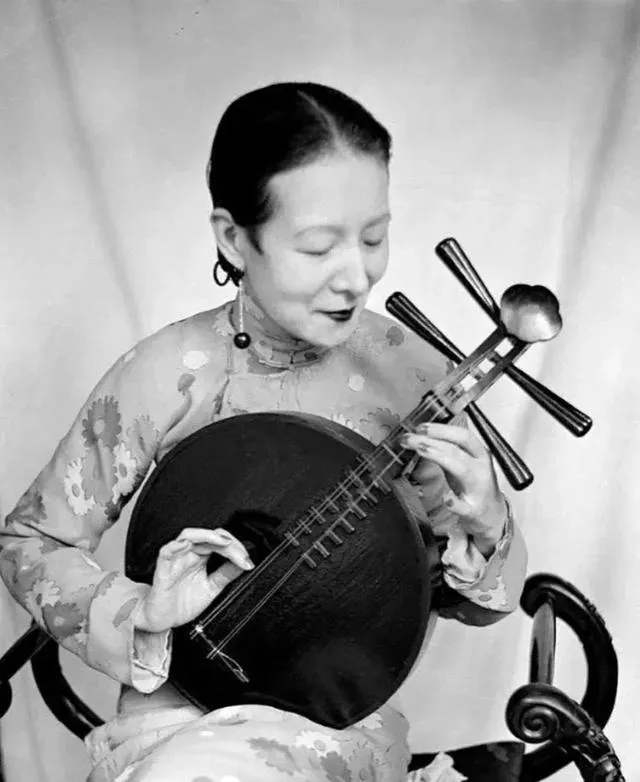 这张坐像是琴人留影,圆圆的面板黑得发亮,四根弦在指下拨开,花绸旗袍的袖口稳稳扣着,眼睛半垂,像在回味上一段旋律,奶奶说家里以前也有把月琴,搬家时给了亲戚,可惜了。