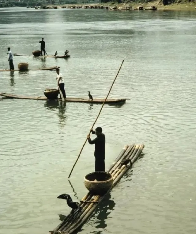这个画面叫漓江打鱼,竹排细长,竹篓挨着脚边,水鸟蹲在船头,杆子一点一点撑,江面像磨开的玉,静得出奇,爷爷说清早雾起来,喊一嗓子都能化开水气,鱼却不一定肯上钩。
