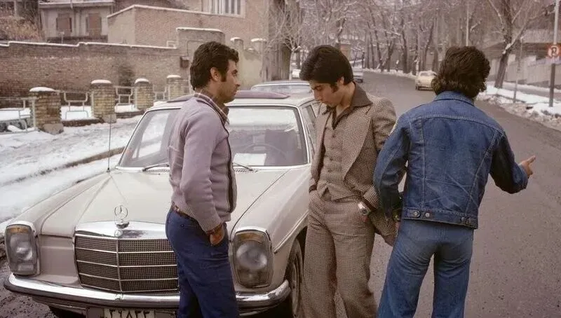 这个画面是冬天,地上残雪没化,三位年轻人靠在老奔驰前,喇叭口裤脚配短呢夹克,头发用油一抹就服帖了,站姿松弛,聊的也许是唱片新歌,也许是周末去哪里跳舞,那时的德黑兰真是城味十足。