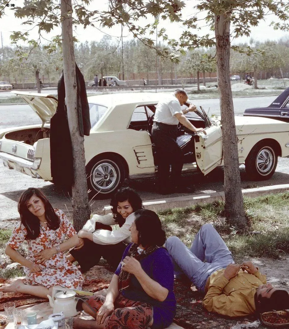 这个周五的树荫下,毯子一铺,暖壶茶杯小点心都到位了,后面那辆小野马后备厢敞开着,男人在车里翻磁带,女人们坐成一圈聊家常,孩子顺着草地打滚,阿姨说伊朗人爱野餐,这个习惯到今天也还在。