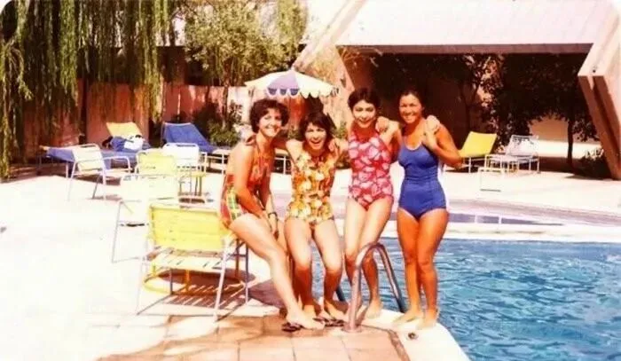 这个泳池的水泛着橘色的阳光,四个姑娘肩并肩,花泳衣是那种大团花的图案,笑得一塌糊涂,背后是金属骨架的躺椅,姨妈说当年学会自由泳的奖励就是一件新泳衣,穿上就不肯上岸。