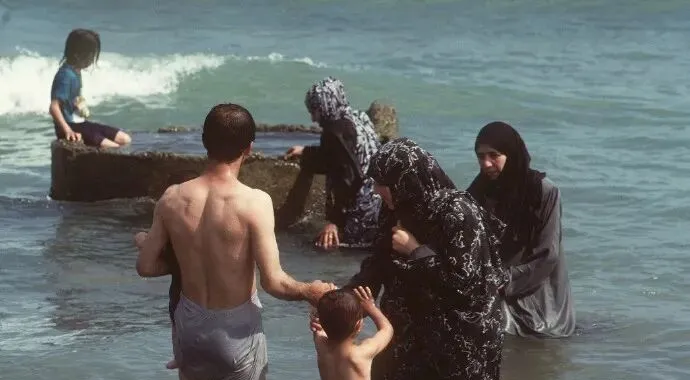 这张海边就不一样了,女人们把自己包得严实,裙摆湿漉漉地拖着水,男人牵着孩子在浪里晃,镜头一冷一热对着看,以前随便换上泳装就下水,现在得先看规矩,同一片海风,吹出的却是两种生活。