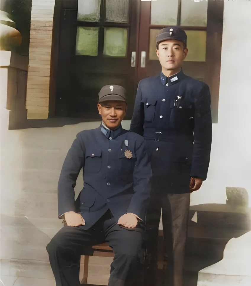 这个端坐一位站立一位的照片叫嘉奖留影,蓝灰制服上胸章一闪,扣子成串,坐着的把手攥紧了裤缝,背后木门漆面厚实,玻璃泛着绿影,光线从侧面压来,把人脸轮廓勾得很硬朗,妈妈看见这张就说,那个年代拍照得板着,笑开了反倒不体面。