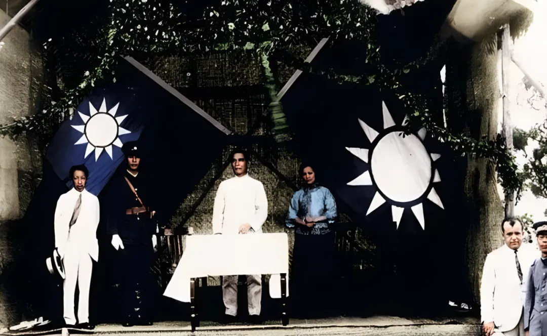 这个铺着白桌布的台子叫主席台,背后两面青天白日旗撑得满满,藤蔓沿梁而下,左边一位戴礼帽的绅士手里还拎着手套,站姿微微外展,像在等口令,台下看不见人,却能想象到掌声的回音,奶奶说,典礼那会儿最讲究队形和口号,远远听去,像潮水一次一归。