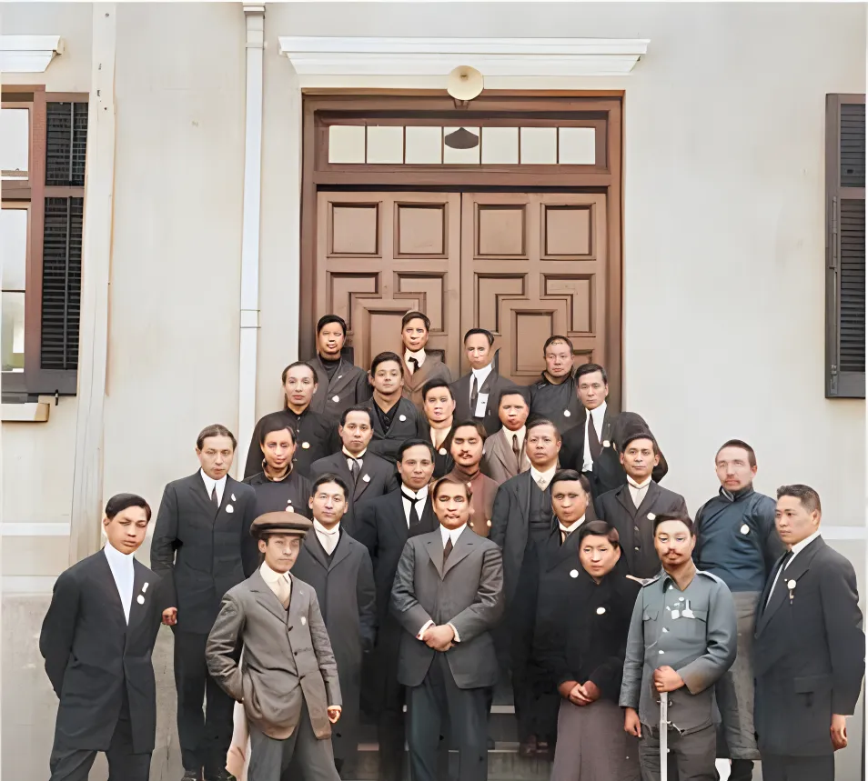 这张门口的大合影叫建制照,木门分格细密,窗棂漆黑,二三十人一层一层站定,中间的人双手交叠,脸上带着一点疲态,衣料有粗有细,西装里襟收得紧,另一边却有人穿着军便服,纽扣像一串硬币,站在角落的年轻人把帽檐压低了点,像是怕阳光直晃眼。