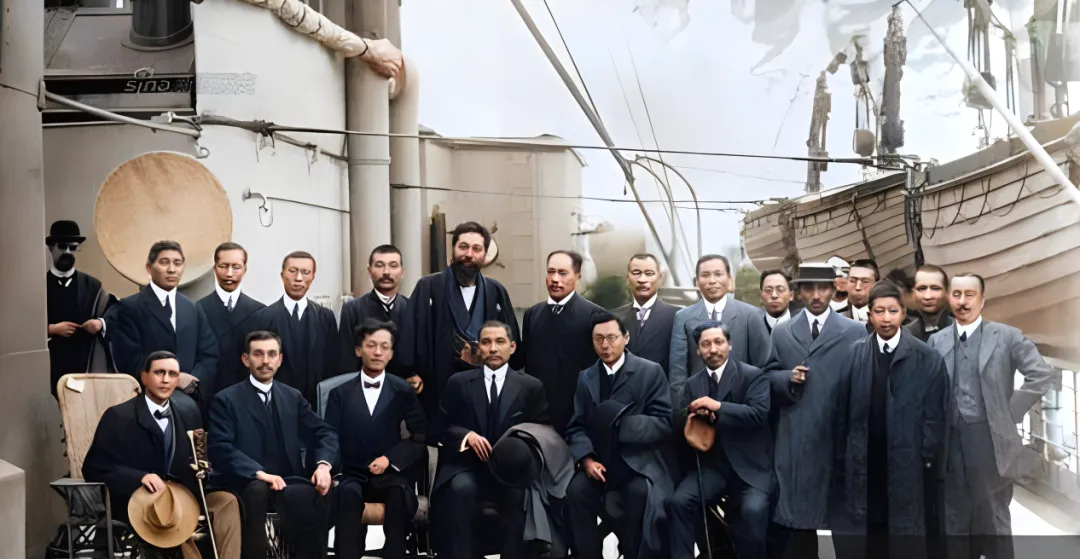 这个船上的合影叫舱面留影,后头桅杆横着,绳索像一把把线尺,长椅上坐的那位手里转着硬草帽,旁边人把大衣搭在臂弯里,西装领口开得不高,海风一吹,衣角就鼓了起来,小时候我最爱看这种细节,帽檐一斜就有江湖味,像电影里的人物要启程了。