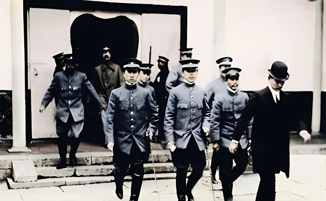 这个一串走在前头的叫队列出门,军校学员扣得紧紧的立领,步子收小但频率快,带头的人手握着短杖,鞋跟落地有节拍感,旁边穿礼帽的黑衣人把身子微微前探,像在催一句快点快点,那时候训练讲究整齐划一,现在看短视频里跑操也整齐,但手机镜头更近,人也更爱抬头看自己一眼。