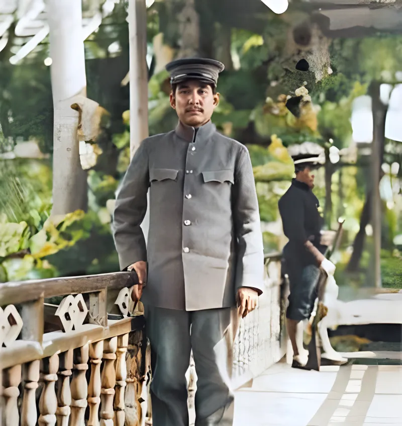 这个靠栏站着的叫制服半身像,呢料上衣双贴袋,扣子排成一线,站姿松里带直,手搭在石栏杆上,掌心压着边角,背后另一个持枪的身影虚在绿影里,风一过,树叶晃起来的光像碎银,外公指着这类照片总笑,说你看,年轻人最要紧的是眼神在前面,脚下哪怕还没迈开,也先把心迈出去了。