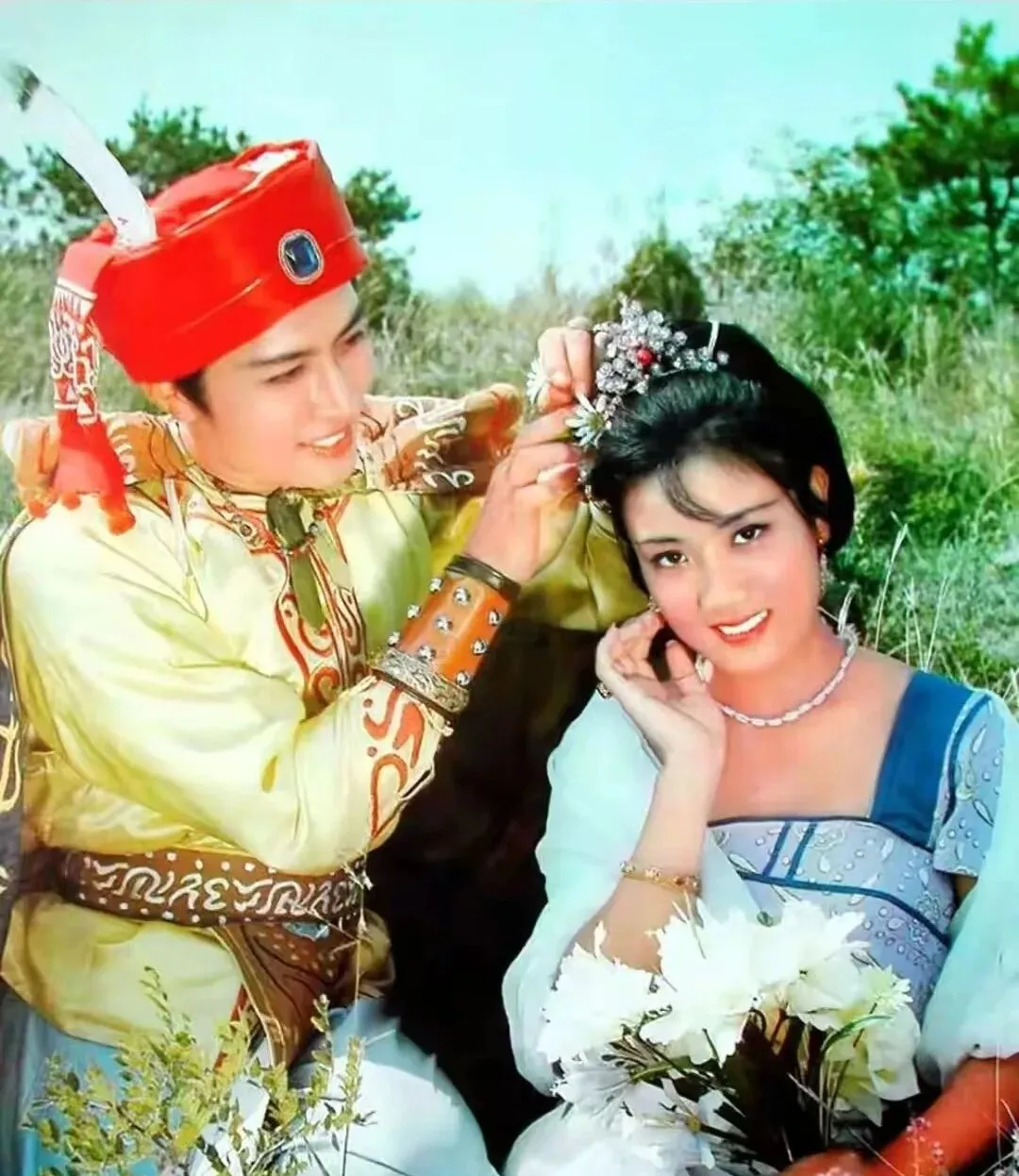 黑纱裹头的民族服那张,她把嘴抿着,情绪在里头憋着,衣襟的滚边绣得细,灯一打,纹样亮起来,她和对手戏站在烛火前,火苗一跳,脸上阴影跟着动,这种老片场的质感现在几乎看不见了。