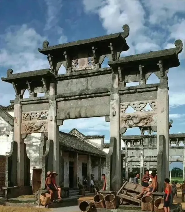 图里这东西叫牌坊,石头起的大架子,梁枋上头雕着兽纹和云卷,底下人家背篓桶匾一字摊开,晒谷面的金黄把巷子点亮,乡下人忙活完坐在阴影里抻个懒腰,奶奶说以前秋后看天吃饭,太阳一露头就抢着摊粮,现在电烘房一开,省心是省心了,院子里的热闹却淡了。