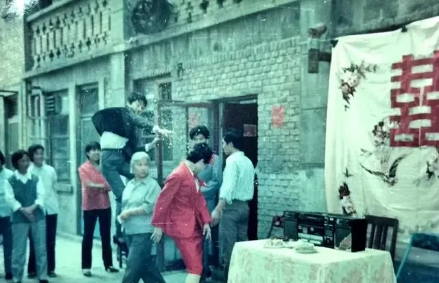 图里是邻里的婚礼,墙上一幅大囍字,红裙子的新娘从门里往外一闪,有人站在凳子上撒米,老收录机摆在桌角,磁带转得哗啦啦,左邻右舍都来站一会儿,谁手里都捏着两颗喜糖,妈妈笑我馋,说别光盯着糖,等会儿还有热闹的闹房能看。