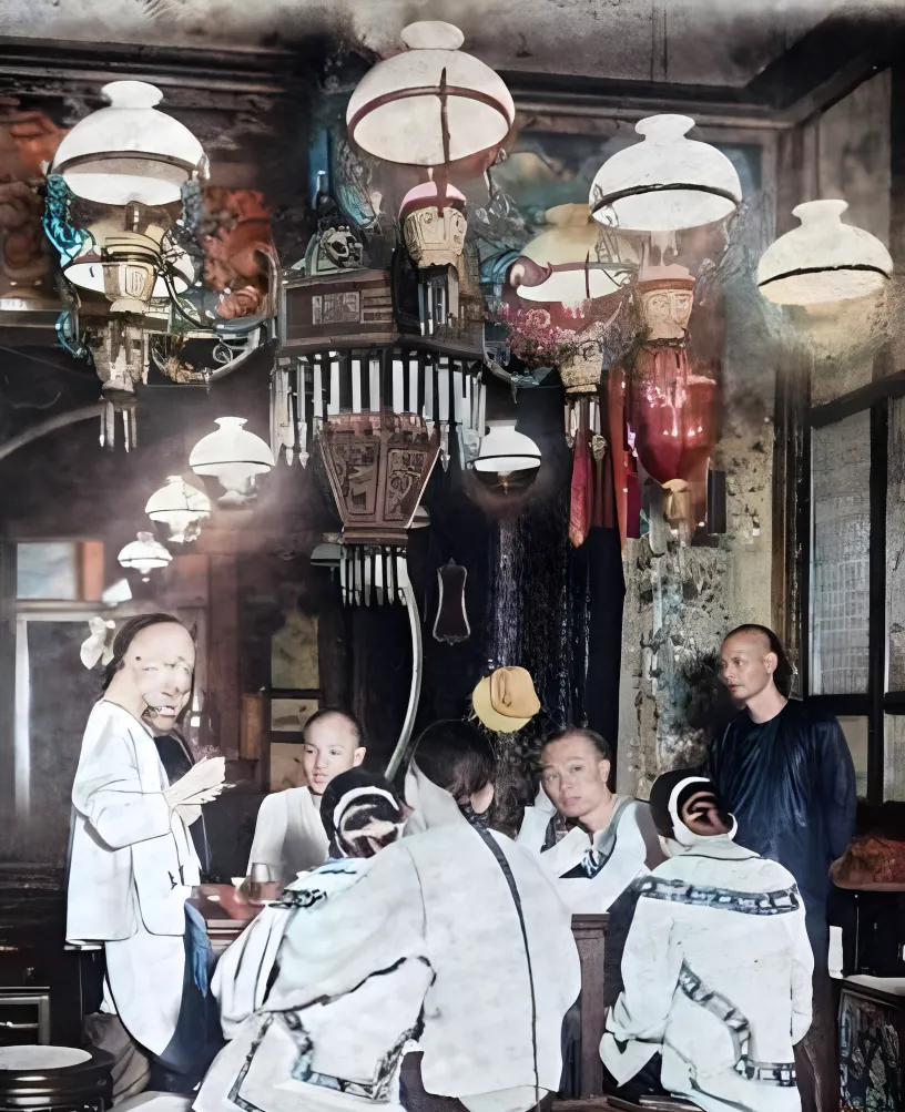 这个热闹场面叫花船夜宴,罩着乳白玻璃灯的吊灯一串串,木梁上悬着绸缎牌楼样的灯座,桌上小盅叮当一碰就脆,年轻人穿白色褂子挨着坐,耳朵边尽是笑声和茶香,那时候夜里要找个清静角落可不容易,现在城里霓虹多得很,偏没这股子挤挨着的热乎气。