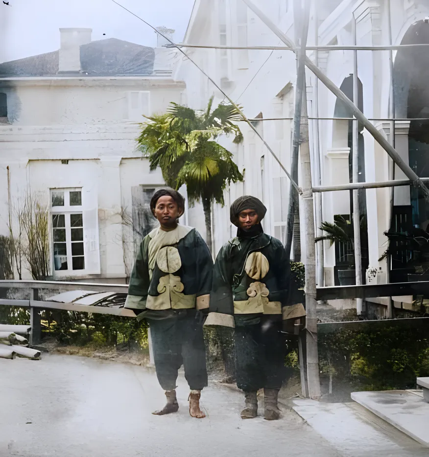 图中两位穿青绿对襟褂子的叫绿营兵,袖口卷着土黄边,胸口缀个大圆补子,脚下一个竟是赤脚,脸上风霜一层又一层,身后是白墙拱窗的洋楼,风从回廊穿过吹得衣摆直响,妈妈看见这张说,打仗不打仗先把鞋穿上啊,这句唠叨可真切。