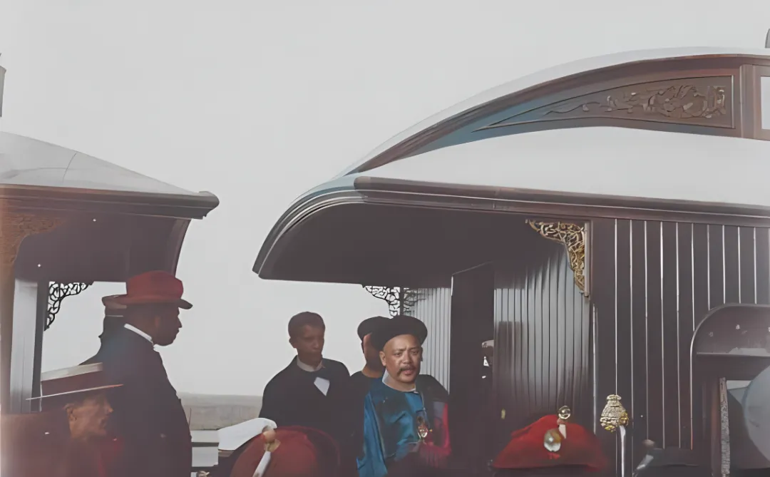 图中精致车厢边穿蓝缎长袍的小个子官员,帽沿压得低低的,身后红顶花翎一字列开,镶金的车檐拐角处雕着卷草纹,木板擦得发亮,风一过,铜活一闪,这阵仗在那会儿就是新政的面儿,家里人看了问谁这么忙,我只笑笑说那年月坐这车的都不简单。