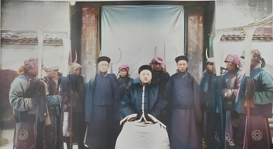 图中正中坐着的这位叫知州,穿黑缎马褂,领口立得笔直,面前摆着圆角案,身后站着持刀的卫士,头上包着各色巾帕,站位有讲究,左边长兵器,右边短兵器,气口要齐,这阵容摆出来就是四个字,派头十足,说句小心话,今天很多发布会也学这套,只不过把刀换成话筒了。