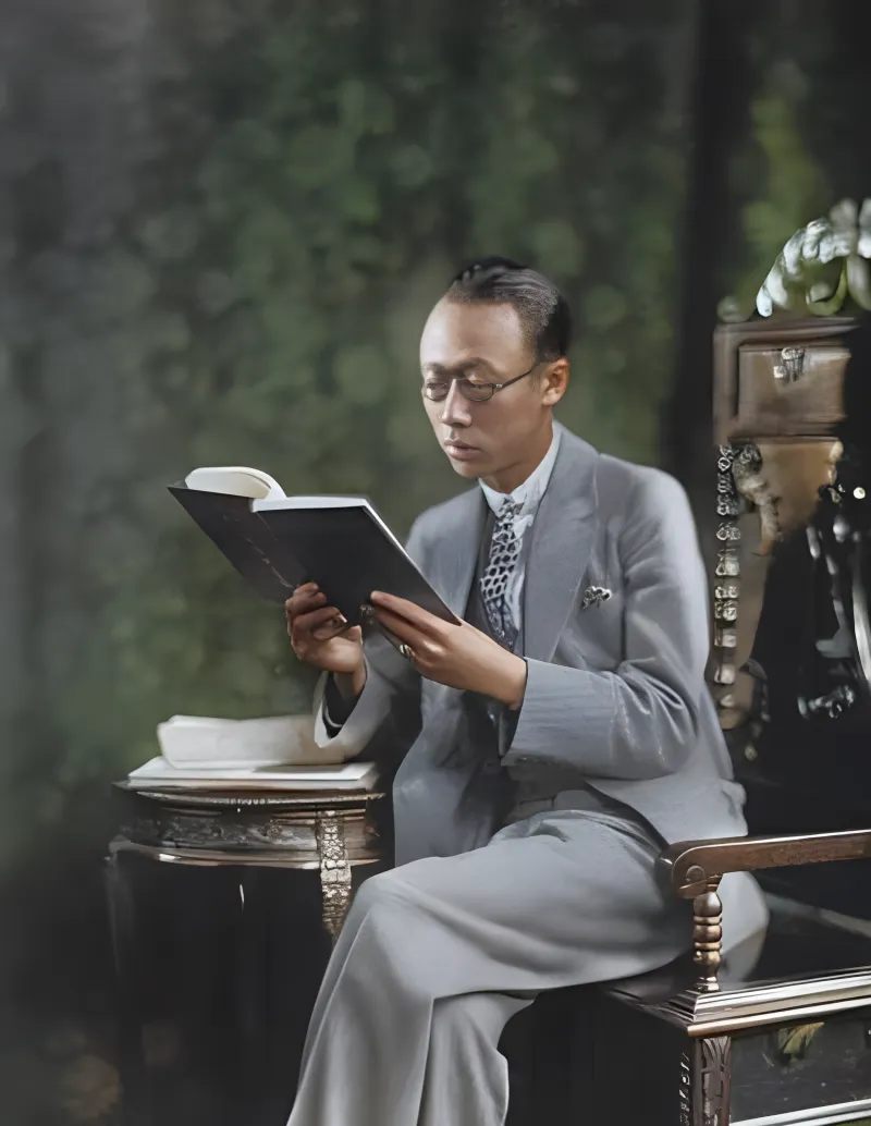 图中这位穿浅灰套装,细花领带,鼻梁上架着圆框眼镜,手里翻着硬壳书,侧边小几雕花精巧,漆色发沉,这身行头在当时可新了,裤线一条笔直,坐姿端着不松,外人看是样板,自己心里未必轻快,外表讲究是一回事,命运的弯路又是另一回事。