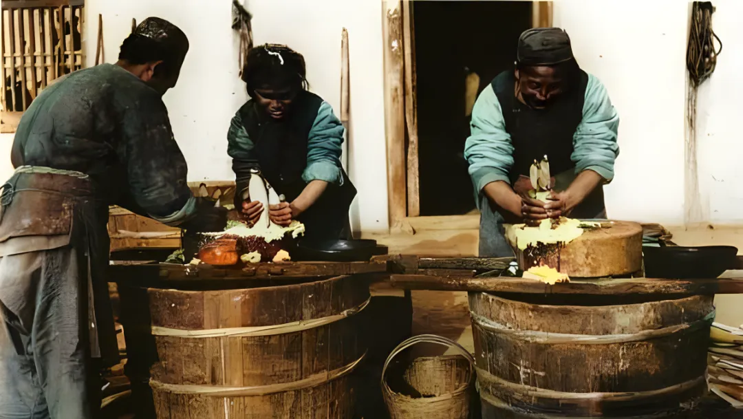 图中硕大的木桶和圆墩砧板就是做藕粉的家什,手里攥着藕把子一拧一搓,浆水顺着纱布哗啦啦流进盆里,旁边铁锅冒白雾,木篦子刮在砧面上,声音瓷实,奶奶说做藕粉的关键是“干净”和“沉得住”,先洗三遍再静置一宿,第二天揭盖那层细白像落雪一样轻。