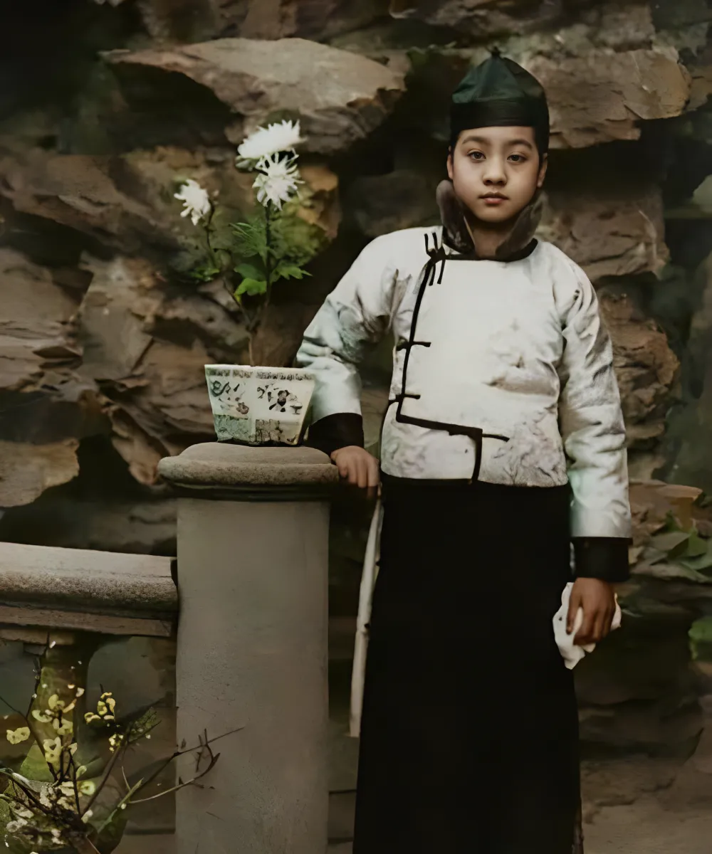 这个白褂黑裙的小人儿其实是个姑娘,头戴瓜皮小帽,襟口做成偏门的“缺襟马褂”,袖口里露出一丢丢里衬,眉眼清亮,手里绢子掐得紧紧的,奶奶说那阵子照相是件大事,穿什么要合辙儿,换套行头照个洋相,回家能讲半辈子。