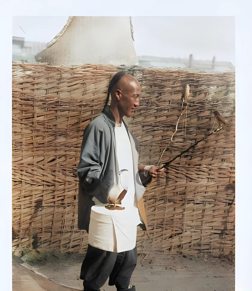 图中提着细杆的叫遛鸟,袖口宽松,腰里还别了一个小笼子的圈,鸟儿在葫芦形笼里跳来跳去,竹编院墙后面阳光刚出来一角,茶摊还没开张呢,他已经拎着笼走了两条街,脖子后面那一截辫梢随步子晃,悠哉得很。