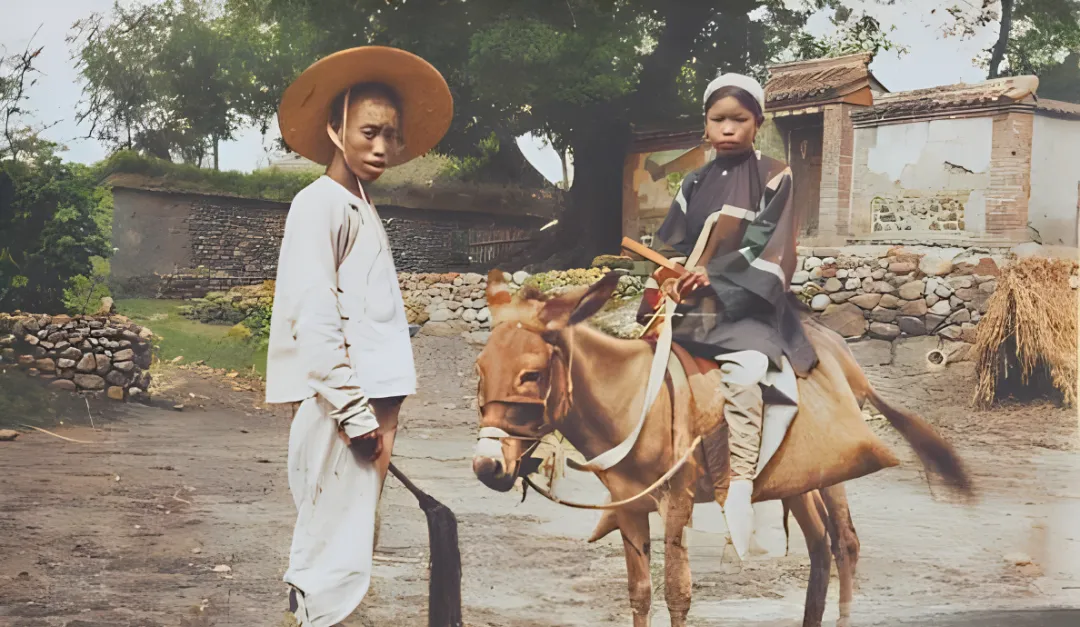 这个出行的组合一眼能懂,妇人坐在木鞍上,脚尖包在绸鞋里,不敢使劲,男人戴大草帽,手里一根长鞭尾巴垂地,路旁土墙石垛,风把草堆刮得乱响,以前出门靠腿和牲口,现在动动手指叫车就来,轻松是轻松了,人和路之间的距离也远了。