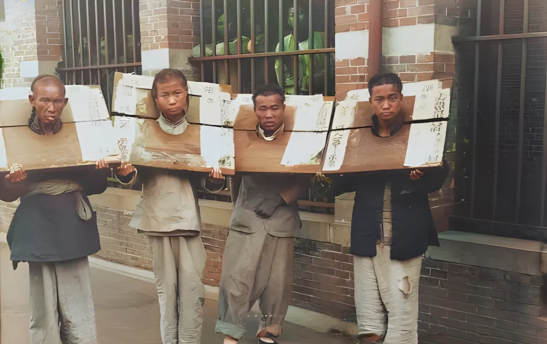 上海租界的这张,木枷前贴了字,写的是会审公廨,几个人被押在路边,窗里人影闪着绿影子,像是围着看个稀罕物,想起一句老话,热闹给了旁人,苦头落在自己身上,这么一想,心口凉半截。