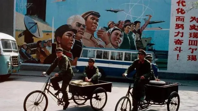 这个热闹街口的墙画背后是宣传栏,前面蹬三轮的是民兵师傅,斗篷盖着货,铃铛一叮,车把一拐就进巷子,画上飞机火箭齐全,写着为现代化努力的话,爸爸说他上班时就爱靠这面墙歇口气,抬头看看几行大字,心里就有数,干活能再加把劲。