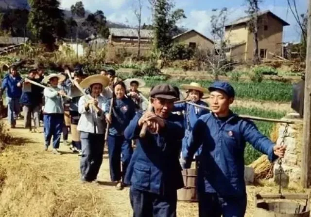 这个肩上杠的是扁担,前后绑着木桶铁镐,青布褂子一色,往地里去得像赶集,太阳一压下来,帽檐都汗湿了,爷爷说挑担走田埂脚要稳,石子硌脚也不能喊,歇的时候把担往地上一架,坐一会儿再起身,活就不知不觉干完了。