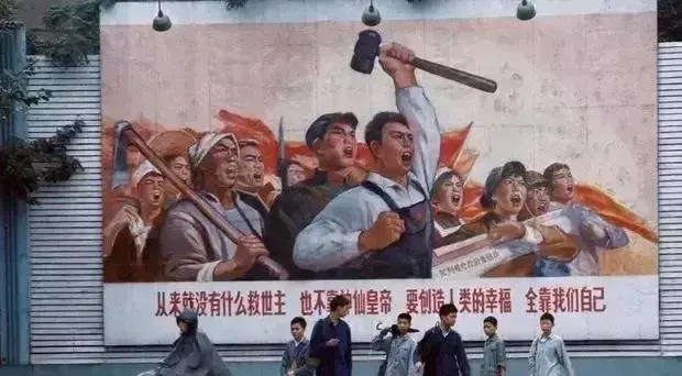 这张墙上的图叫工人宣传画,锤子举到半空,旁边有人扛着铁锨,嘴边的口号写得直来直去,天阴着也不耽误看,路过的人不抬头也知道上面写啥,厂门口的风常年把角落吹得发白,字却红得不退。