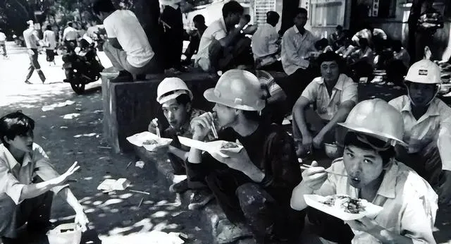 这张是工地午饭的光景,铁盔一摘就当碗扣在脚边,几口热饭下去,人立马有了精神,旁边树荫下一地长条影子把热气压住一点,我记得小时候跟着大人去工地送水,铝壶咣当咣当撞在一起的声音,到现在还在耳朵里晃。