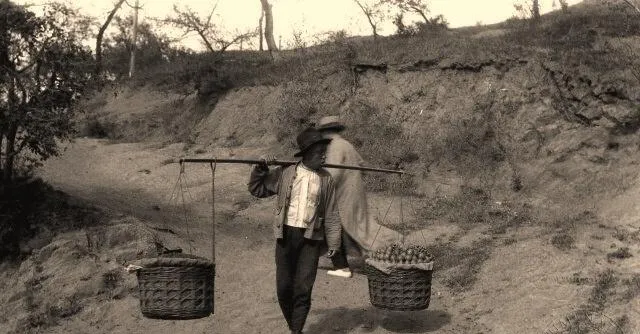 图中这根扁担叫挑担,竹质弯成弓形,两头铁钩子挂着粗藤篮,人一前一后往山坡上挪,肩窝处垫着折叠的旧布,走到台阶处要蹭一下气,爷爷说担子里的不是货,是日子分量,前半程靠腿,后半程全靠心。