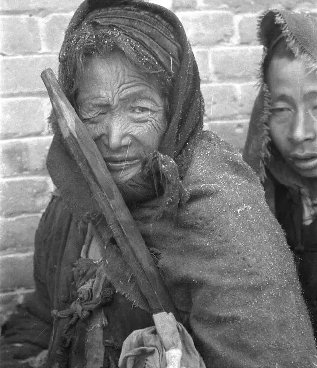 这位婆婆裹着斗篷,边上小的探出半张脸,木棒在手里攥得紧,眉眼里都是风霜刻出来的皱纹,这一帧谁都不忍多看,可老照片就这样直直地放在桌上,逼着你承认过去的寒冷确实那么冷。
