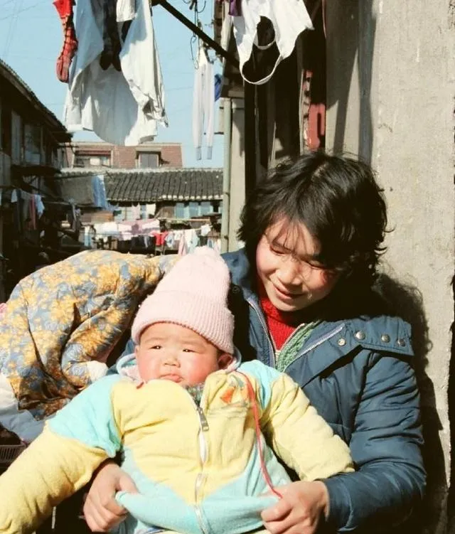 图中小孩穿得臃了点,粉色帽子压到眉上,抱娃的人笑得暖,后头的竹竿上晾着被子和衬衣,弄堂窄,阳光像细绳子一样抽下来,妈妈说那会儿孩子哭闹,一碗热粥一裹被角就安静了,现在小玩具一堆,倒也不见得更省心。