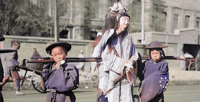 这个场景有点稀罕,木偶戏装扮精致,旁边的小脚夫抬着架子往前挪,帽檐把汗水挡住一点,鼓点一响,围观的人就凑过来了,旧城的热闹多半藏在这些角落里。