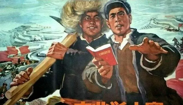 图里两个人站在坡地前,手里举着小红书,背景是梯田和旗子,颜色冲得很满,像把热度直接涂在纸上,那个年代喜欢把未来画得红红的,墙上一贴就有劲,现在房子刷成浅色系,情绪往里收了些。