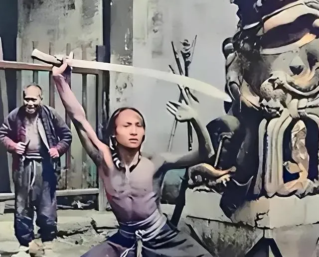 这张里人正舞着长刀,胳膊上青筋绷着,旁边老者笑眯眯看着,地上是石狮子的爪子,刀光一摆,空气都像被切了一道,小时候在庙会边上也见过把式亮功,吓得我躲到大人身后,等他收刀抱拳,我才敢探出头。