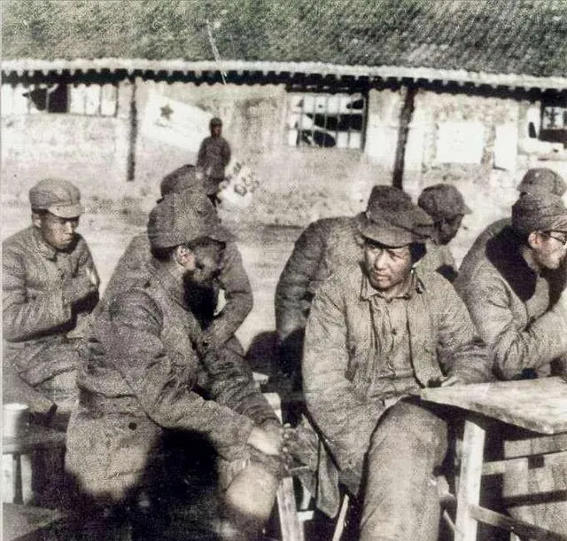 这张是战地就餐,铝饭盒搁在脚边,大家蹲成一大圈,热气从米面里往上冒,谁的咸菜多一点就夹给身边人,饭勺敲一下盒沿,叮的一声干脆,以前一顿能吃上肉花就是喜事,现在我们挑挑拣拣也不好意思。