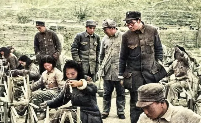 图中这些是大生产里的纺线架,木轴子噌噌地转,女兵低头理线,手指头被线勒出红印,旁边的干部弯腰看了看,笑着点头,线团像小山堆起来,晚上缝军衣就不慌了。