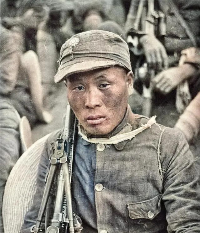 这个坐着的人是前线回来的战士,脸上糊着灰,脖子上缠条破布,袖子口露着针脚,枪支靠在肩窝里,眼神死沉死沉的,像一夜没睡,旁边有人递水,他只抿了一口就把杯子按回手里。