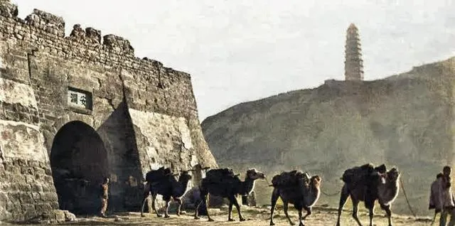这张是安澜门和驼队,石门洞上头刻着字,后面塔影戳在天上,骆驼一串接一串,铃铛叮当往前走,赶车的人低着头数步子,那时候物资靠腿和蹄,现在一脚油门就跨省了。