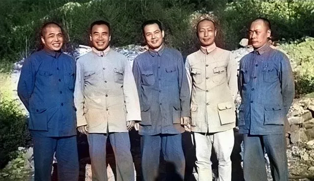 图中这张是干部合影,几个人站在树荫下,衣扣扣到最上头,笑里带着风尘味,手背在后边,影子正好压在脚面上,有人说右二像叶子,有人说像谁谁谁,名字就不细认了,气象在这儿就够了。